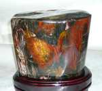 [辽西树化玉简介]:辽西树化玉是由1.3——1.8亿万年前的树木被大自然的变故埋藏于地下,在特殊的地理环境作用下,经二氧化硅等物质所置换.填充,又经水中的铁.锰等氧化物质染上黄.红.蓝.紫黑.白.灰等颜色形成了五彩斑斓,镶金叠玉的天然有机宝石,在亿万年的演化历程中,它仍保留着美丽的年轮,树皮,节疤,虫洞等当年的原貌特征,是不可再生的珍贵资源,它集化石.奇石.宝石多种特色于一身,是真正的宝石贵族。在我国古代就有千年木能避邪之说,不用说亿万年前的高贵树种吸收了天地日月之精华,已化成了宝玉之身,因而被视为可驱邪.镇恶.可聚天地之灵气,可呈祥瑞,有官有树石可亨通,宅有树石乃平安的说法,备受大收藏家等各界有识之士青睐而闻名中外。在珠宝玉石目录里,树化玉早已被列为天然有机宝石,2011年在北京举办的中国玉器百花奖大赛中辽西朝阳树化玉雕刻获金奖。