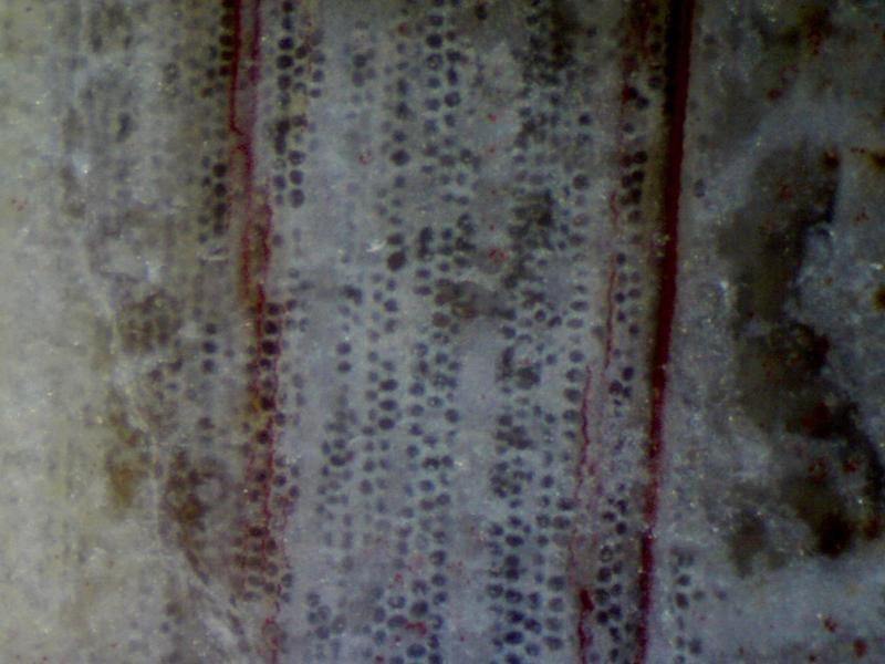 硅化木的矿物组成主要为石英类矿物,根据其结晶程度和石化程度的不同,可有隐晶质石英、玉髓、蛋白石及方解石、白云石、褐铁矿、黄铁矿等。