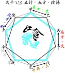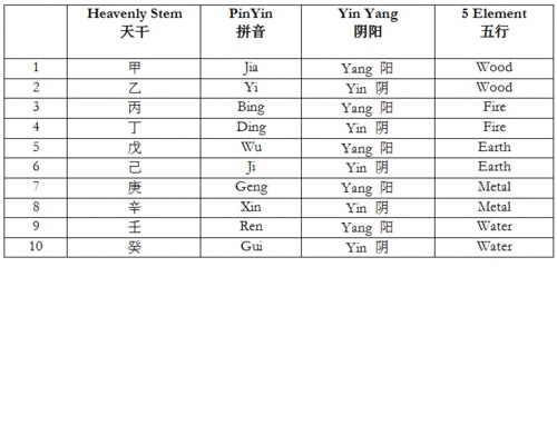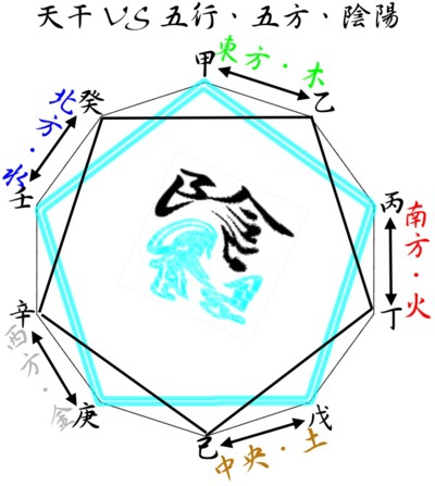 天干的十个符号按其自身的含义可以与五行的五个符号和五方进行匹配。