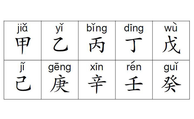 天干,是中国古代的一种文字计序符号,共10个字: 甲、乙、丙、丁、戊、己、庚、辛、壬、癸,循环使用。