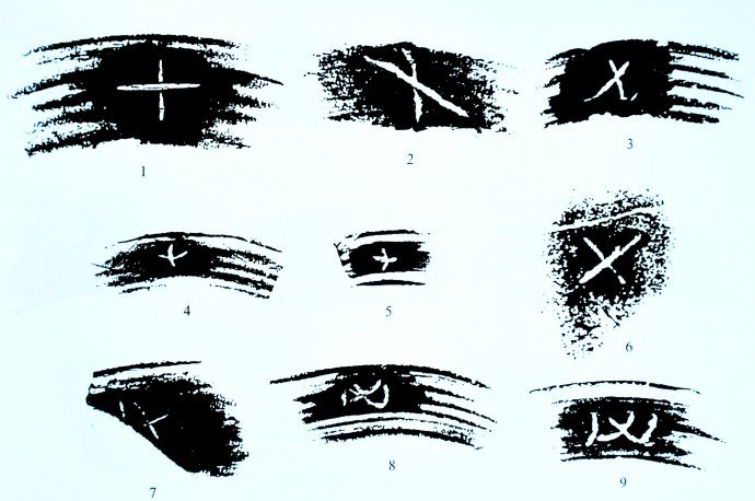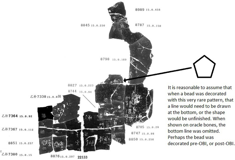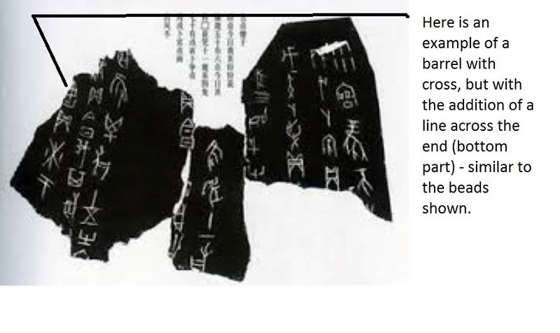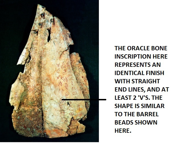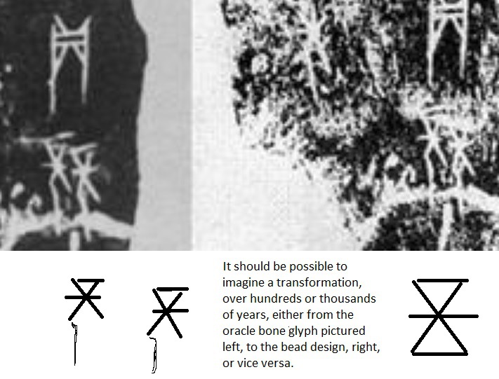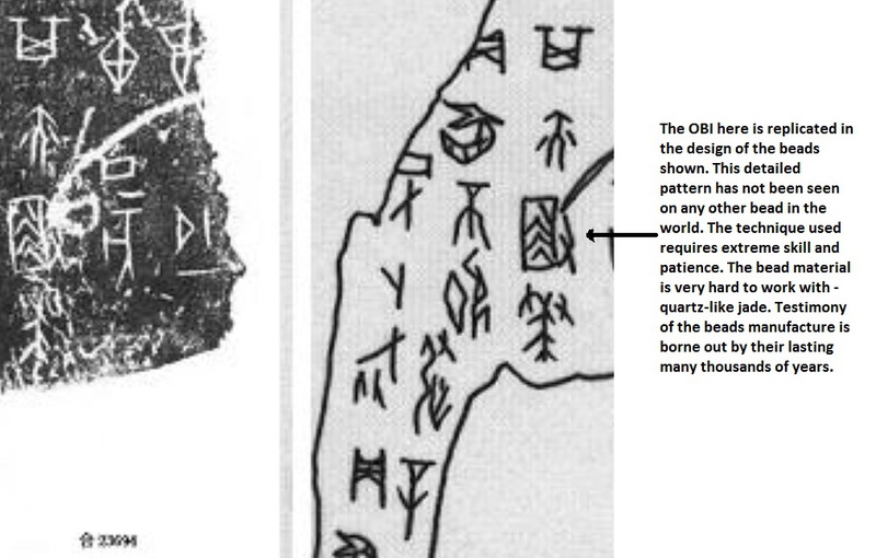 THE PURPOSE OF COMPILING THE LISTS BELOW IS TO ASK THE FOLLOWING QUESTION: ARE THE BEADS SIMILAR TO VERY EARLY CHINESE GLYPHS, BANPO, OBI OR BRONZE INSCRIPTIONS? WE ARE NOT STATING THAT THE BEAD DESIGNS ARE EXACT REPLICAS OF OBI, HOWEVER IT IS QUITE EVIDENT THAT THERE ARE SIMILARITIES FROM ALL THE ERAS QUOTED ABOVE, INCLUDING LIANGZHU CULTURE KNOWN MARKINGS.