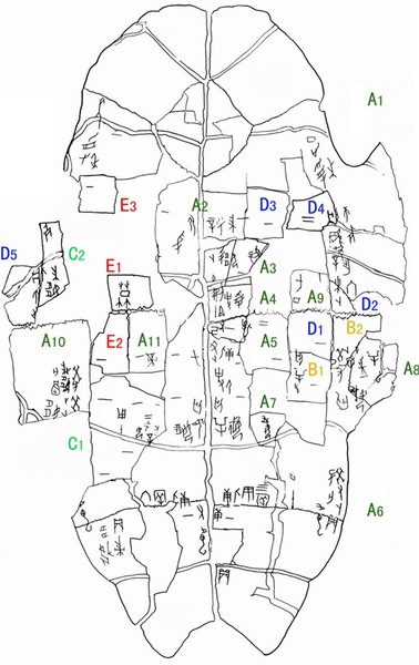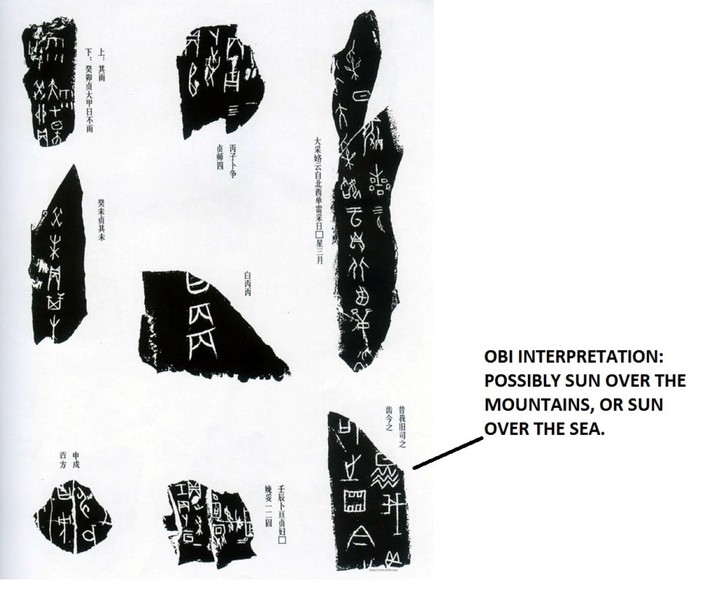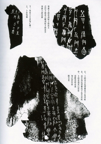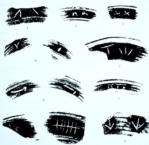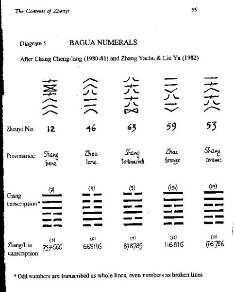 我引述:虽然一直声称,类似的迹象在新石器时代遗存发现的最古老的可靠那些日从武定(c1238-1180 BC)的统治。 ...... 1978年,张正龙提出了他的理论,认为他们是六十四卦。 ......有时是数字,有时线。通常在题词的结束。 ..The虚线有时有三个部分,而不是两个。的三个数字组也已发现,但这些往往是稍后日期,以及到周次。这是可能有相关性卦卦和,有利于论断卦比卦年长之间的历史关系来看,..