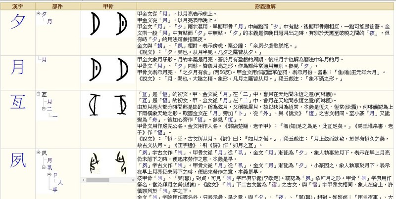 就這樣,利用左口月和右口月的造字規則,我已經破譯了涉及月部首的全部的甲骨文字,它們全部都是關于月亮在農曆一個月中的變化情況。據此我們可以知道夏商都是太陽歷記時,但是在甲骨文系統中我們發現,殷商時代已經完成了對月亮在一個圓缺週期里的觀察并造出了一個系列的甲骨文字以記錄月亮的變化