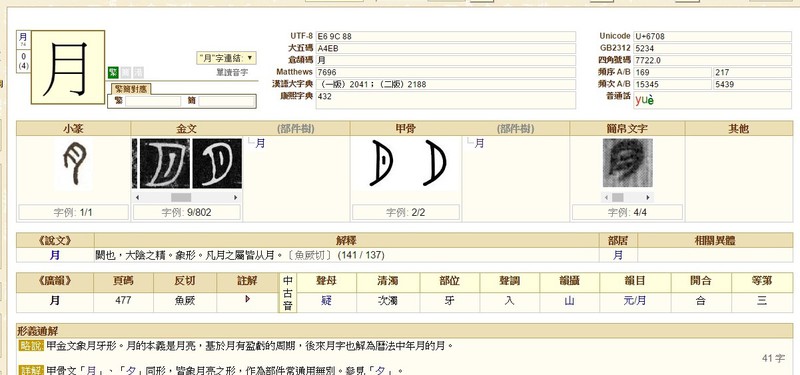 甲骨文月選擇這個月牙形作為月亮的標誌性意符藉以和太陽相區別,這確是商前人類(不一定是殷商人)的偉大創造。農曆一個月中,月亮只有兩天是圓的,其餘時間大多數是缺的。這個月牙有兩個方向,這是研究月部首字的關鍵:每月初二到十四月亮朝左邊缺(暫名:左口月);十七以後到廿八右邊缺(暫名:右口月)。廿九到初一看不見月亮本體。一個月中有六分之五的時間月亮是缺的,所以選擇月牙表示非常科學準確,這就抓住了月亮的本質特徵。一看就知道缺口向左的是上半個月,缺口向右的是下半個月。這一本質特徵就成為甲骨文月部首字的造字的基本原則。