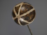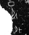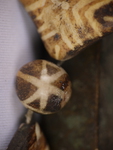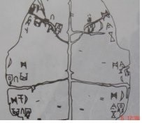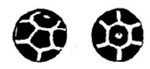 我认为:这是乌龟头部和眼睛,用来做鳖甲甲骨文读数的品种。(Ocadia Sinensis, 它是用于占卜的两个最常发现的物种已经从商代遗址恢复之一。可能是一个跨品种有: