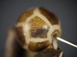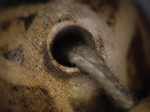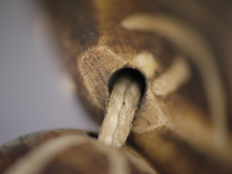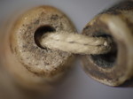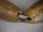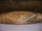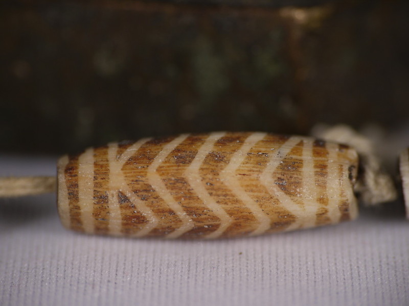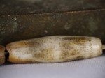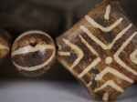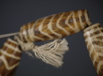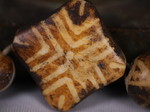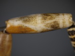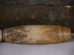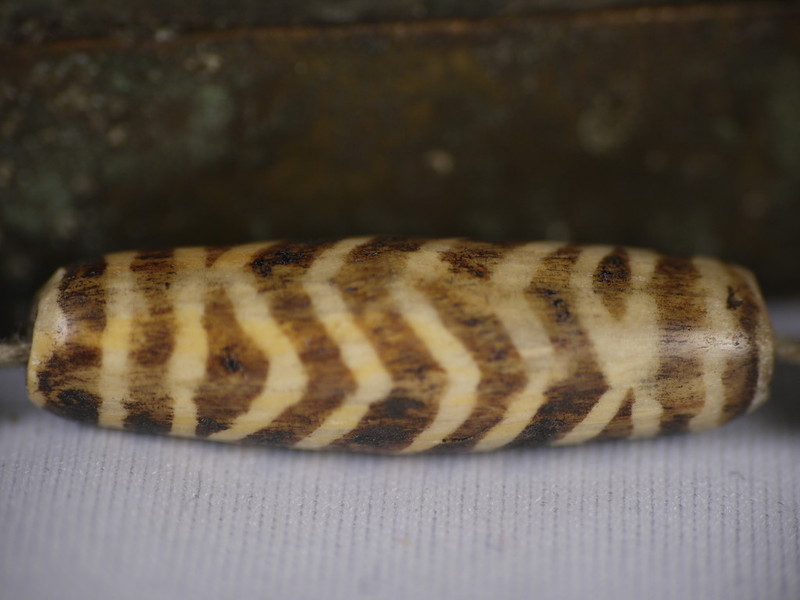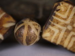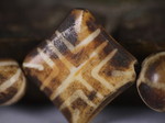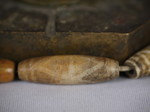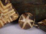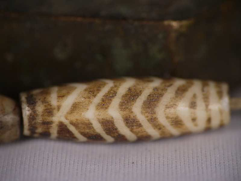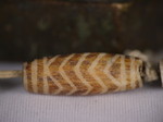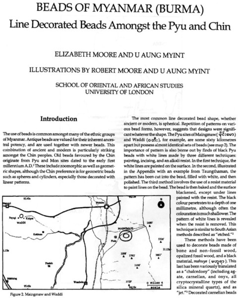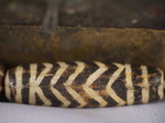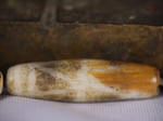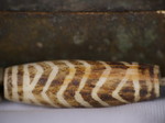 30。桶,白线(黑色,两端各有两条线,三锯齿形线在中间,30毫米长度):Maingmaw记录现场实地调查过程中。无螺纹孔。此珠,“老虎尾巴”的设计,被认为是最有价值的,如果三角形触摸端线。一些例子已经痊愈从Srikshetra以及Maingmaw的。