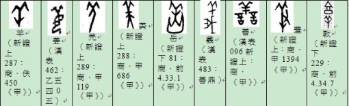 羊、姜、羌、美、岳、?、祥、?、善、?、恙、羞、?等是一组以「羊」为核心的文字。「羊」字很明显的即是动物羊的羊头图象,以示羊,但是此一图象所表之实体概念还受到中国古代羌族羊神崇拜的影响,从而以羊为中心形成一系列如下之字:
