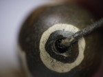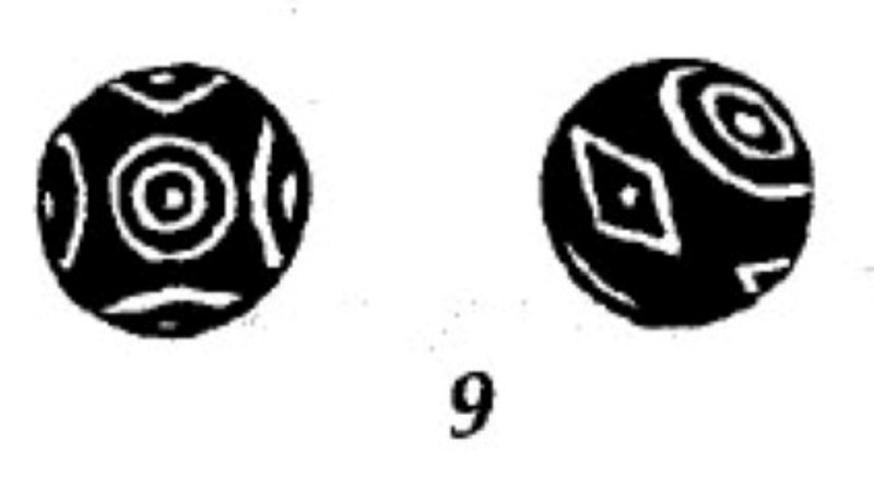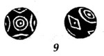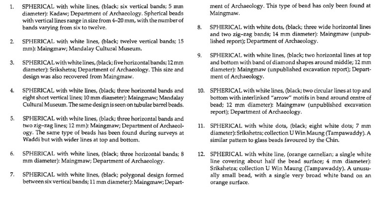 9。球形,用白色线条(黑色在中间左右的钻石形状的带的顶部和底部的两条水平线;12毫米直径):Maingmaw(未发表发掘报告);出发考古。